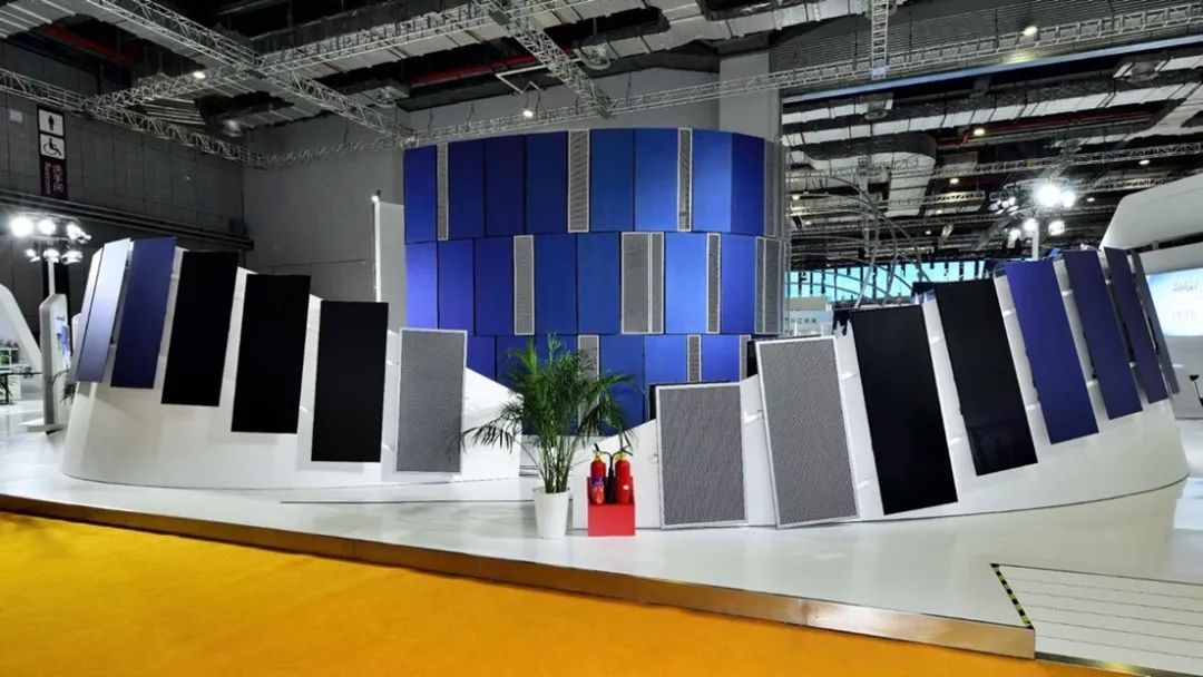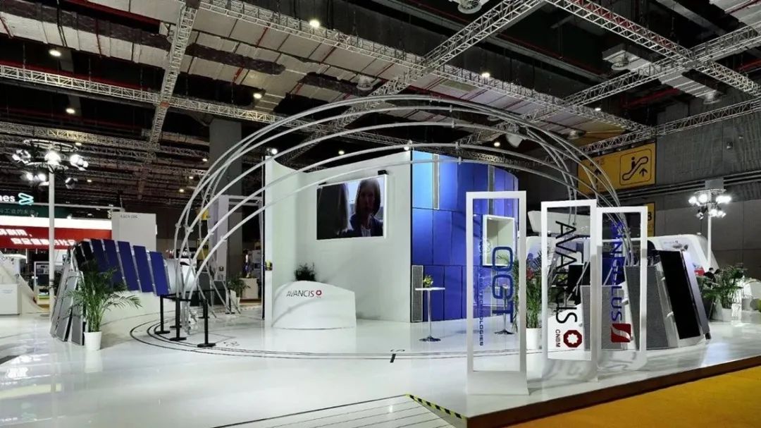 德国AVANCIS公司的展品造型灵感来自于地球绕太阳公转的椭圆形轨道,线型轨道上的太阳模拟灯照亮墙体立面并且展示出造型外立面的色彩过渡。整个造型的外立面由AVANCIS的高端主打产品SKALA系列铜铟镓硒(CIGS)薄膜太阳能电池组成。