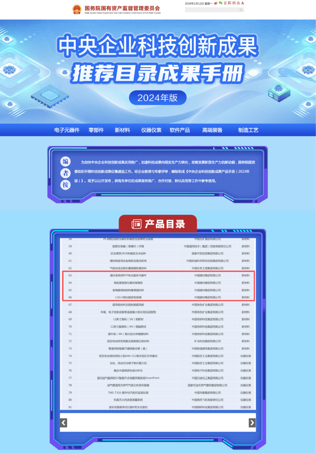 来源:国务院国资委、集团各企业 发布时间:2026-01-13近日,国务院国资委印发《中央企业青青草影视成果推荐目录(2024年版)》,收录电子元器件、零部件、新材料、仪器仪表等7个领域263项青青草影视成果。中国建材研发的4项新材料成功入选推荐目录。