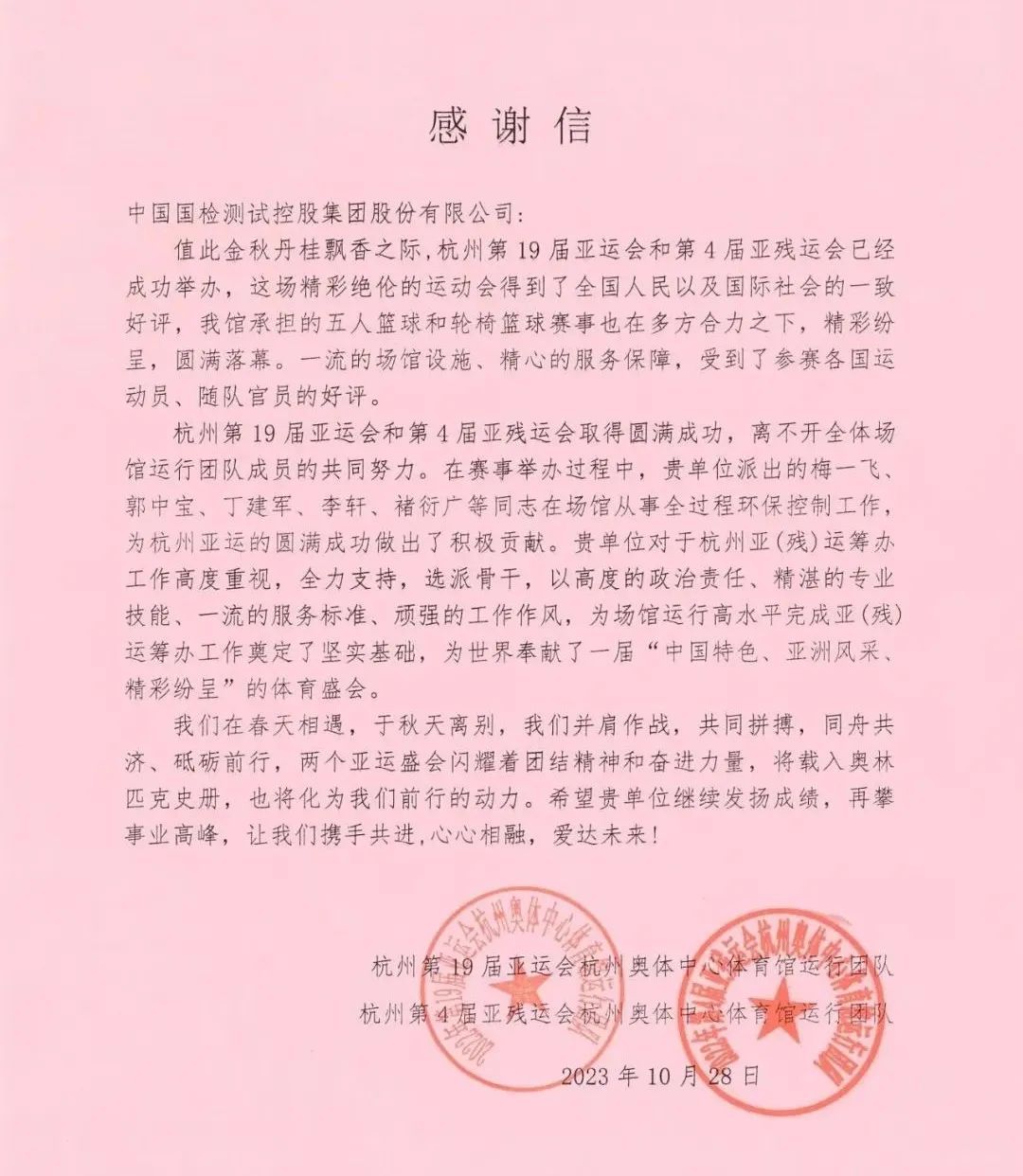 杭州亚(残)运会向国检集团致感谢信