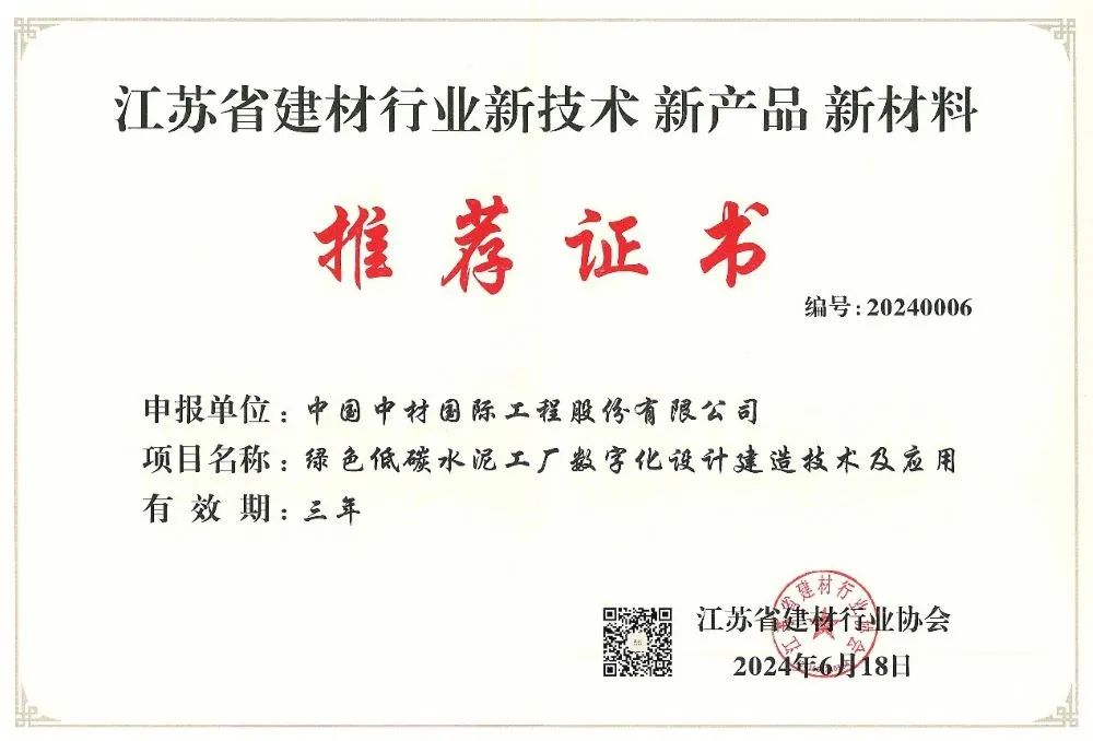 中材国际(南京)“绿色低碳水泥工厂数字化设计建造技术及应用”入选江苏省建材行业新技术新产品新材料推荐目录