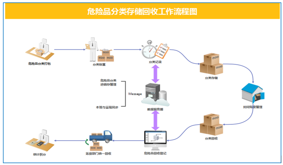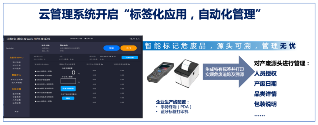 其中,“云管理”是本设施及系统的核心关键点,通过云管理系统,用户只需采用设施中的手持终端,蓝牙标签打印机等进行“扫码”,即可生成一个专属标签 青青草影视高清,完成人员授权,记录产废日期与品类详情等标记,以此对危废产生,收集,贮存,处置,利用等核心环节进行全程信息化跟踪管理,让危废从入库到回收,实现了来源可查,去向可追。