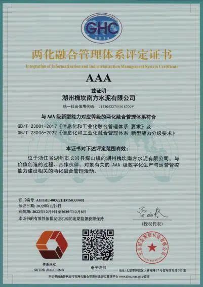 全国水泥企业首家两化融化AAA级证书