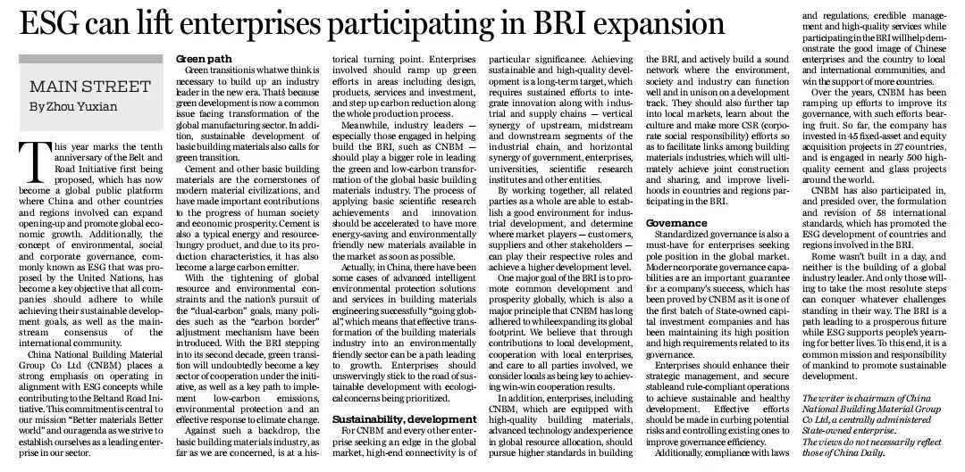 今年是“一带一路”倡议提出十周年 青青草影视,作为联合国提出的环境,社会和公司治理的综合概念,ESG逐渐成为国际社会的主流共识,国家英文日报《中国日报》刊发了中国建材集团党委书记,董事长周育先署名文章《ESG理念助推企业迈向“一带一路”国际化新征程》,文章提到,中国建材“材料创造美好世界”企业使命与ESG理念高度一致,践行ESG理念,服务共建“一带一路”是创建世界一流企业的坚定选择。