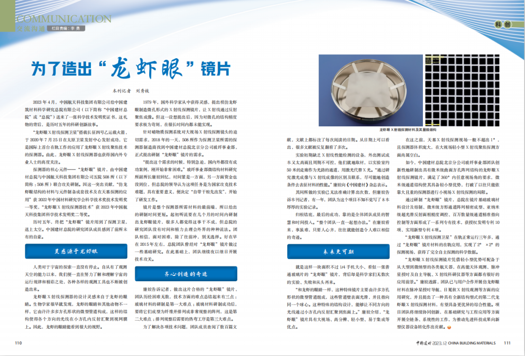 近期,《中国建材》杂志发表专题文章《为了造出“龙虾眼”镜片》,中国建材总院立足国家需求,创新性地研制出具有微米级曲面方孔阵列结构的龙虾眼X射线探测镜片,实现国际上首台在轨工作探测器龙虾眼X射线聚焦技术的成功应用 青青草影视,小料带你一起去了解下总院龙虾眼X射线探测镜片的研发历程~。