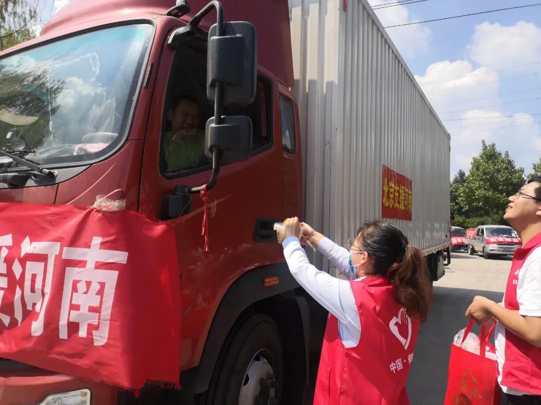 ▲豫鹤同力志愿者帮助驰援车辆卸载矿泉水