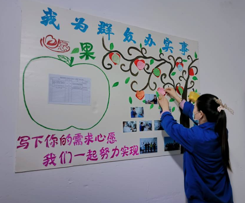 精准突破党小组采取“1+2”工作模式打通关心关爱群众的“最后一公里”,“1”是党小组9名党员聚焦职工的“微心愿”为问题导向,职工把自己的“微心愿”或困难诉求用便签贴在控制组办公室“心愿树”看板上,并署上自己的姓名,“2”是党员撕下贴纸认领“微心愿”+帮助职工实现“心愿果”责任落实 青青草影视,通过“一名党员认领一件或多件”“多名党员认领一件”等方式,党小组按照“三个一”严抓落实,安排专人每日一收集整理“微心愿”,每周一上会讨论,并制定解决措施,党小组能解决的,限时解决,一时解决不了的,上报公司党支部协助解决,并将“心愿果”落实情况每月一公示,对于“微心愿”落实结果由诉求职工用“红五星”在看板表示“满意”。