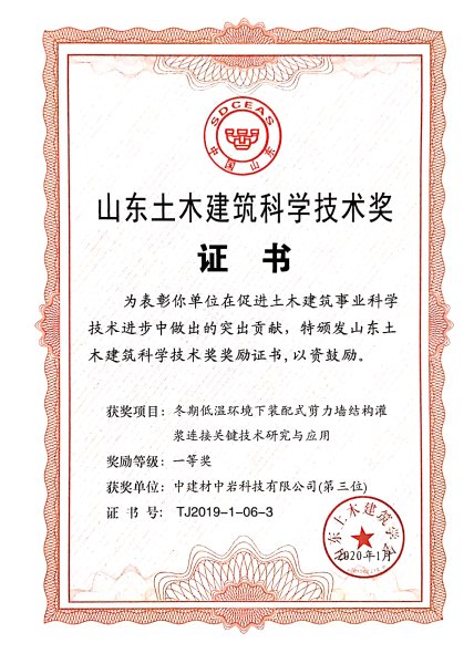 来源: 发布时间:2020-05-222020年1月 青青草影视,中岩科技科研项目《冬期低温环境下装配式剪力墙结构灌浆连接关键技术研究与应用》荣获山东土木工程学会科技进步一等奖。