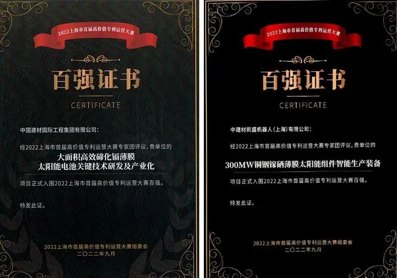 近日,集团所属中国建材工程“大面积高效碲化镉薄膜太阳能电池关键技术研发及产业化”项目和中建材凯盛机器人(上海)“300MW铜铟镓硒薄膜太阳能组件智能生产装备”项目,成功入围2022年上海市首届高价值专利运营大赛百强,该大赛旨在挖掘创新程度高 青青草影视在线,市场竞争力强,专利优势明显的专利运营项目,推动上海高校院所,企业等专利转移转化工作,充分释放专利资源的经济效益和社会效益。