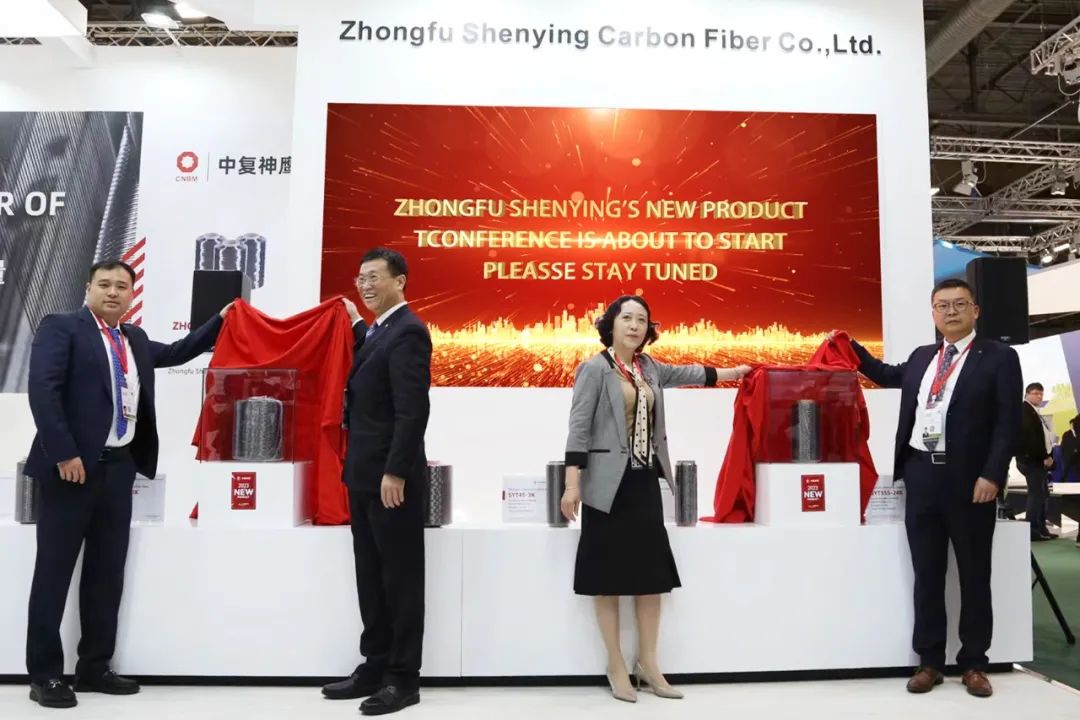 展会首日,中复神鹰现场举行了新品发布会,携新品SYT55S-24K 青青草影视高清,SYT45S-48K正式亮相,成为展会焦点,中国建材股份副总裁,中国复材党委书记,董事长薛忠民,中复神鹰总经理刘芳,副总经理李韦,副总经理陈秋飞等出席发布会。