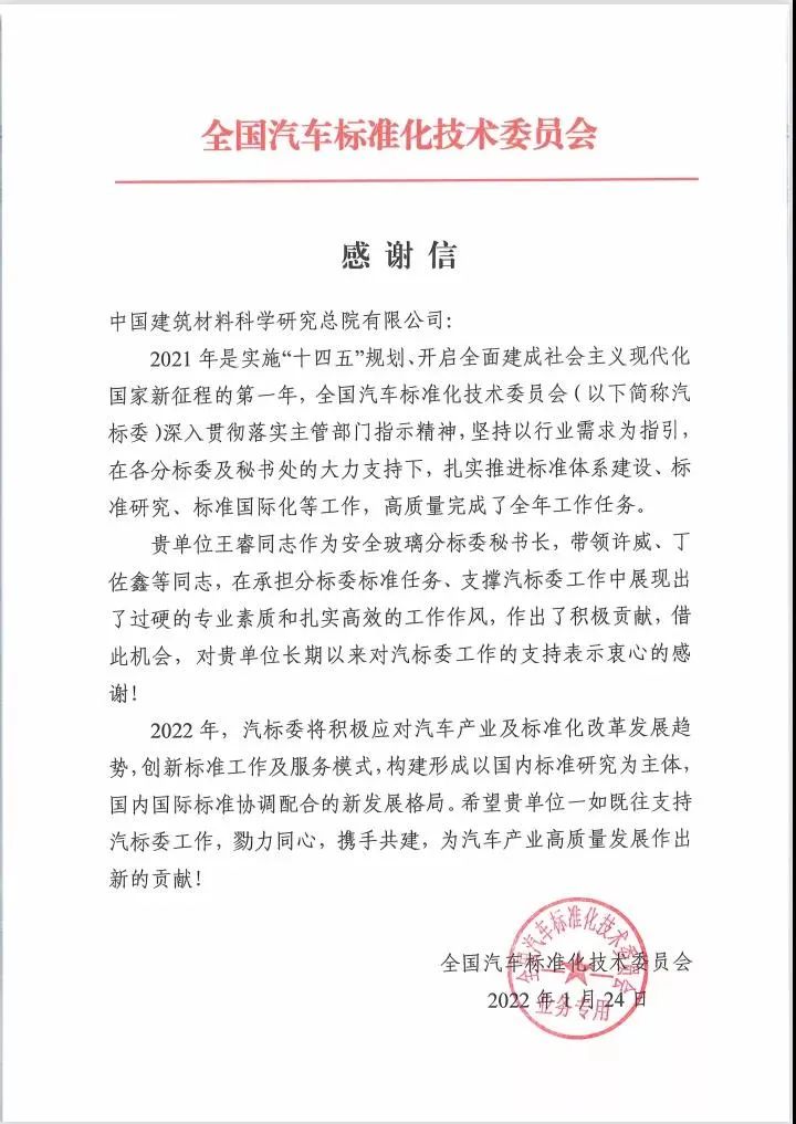 近日,全国汽车标准化技术委员会发来感谢信,对国检集团在承担全国汽车标准化技术委员会工作中做出的积极贡献予以感谢和表扬 青青草视频,对国检集团玻璃检验认证院王睿,许威,丁佐鑫等优秀个人在支撑全标委工作中展现出过硬的专业素质和扎实高效的工作作风予以表扬。