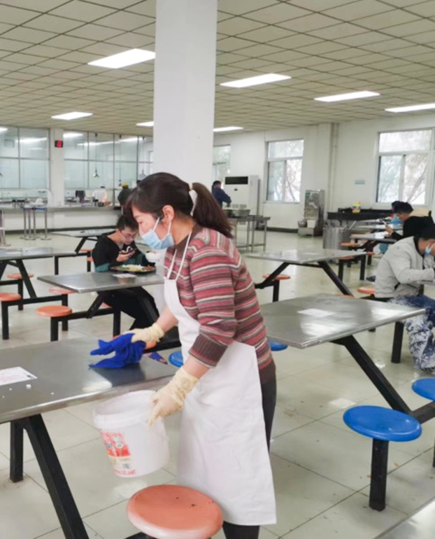 叶片大浦工厂第一时间组织筹备员工住宿事宜,安排采购各类抗疫物资,组织专人负责员工住宿区域的建设、生活用品的发放以及人员的疫情排查与入住登记。工厂食堂的10名员工每日承担着1500多人的饭菜供应,由于人手紧张,生产车间发扬团结一致、互帮互助的精神,调配两位女工协助做好食堂卫生工作,为保障各餐饭菜准时、足量供应做出了积极贡献。