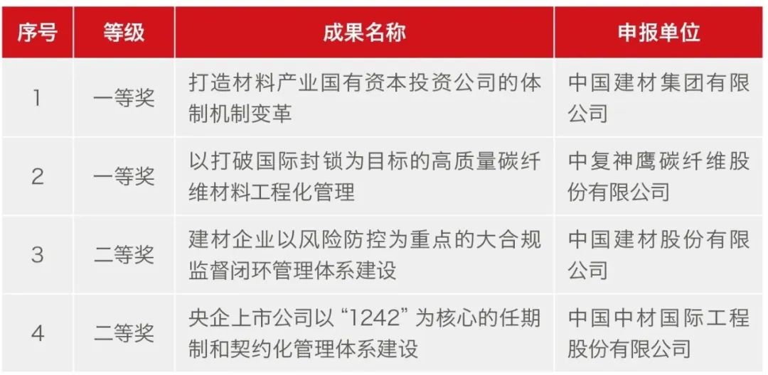 近日,全国企业管理现代化创新成果审定委员会发布《第二十九届全国企业管理现代化创新成果名单》,中国建材集团4项成果入选,一等2项,二等2项 青青草影视,首次同届荣获2项一等奖,实现了历史性突破。
