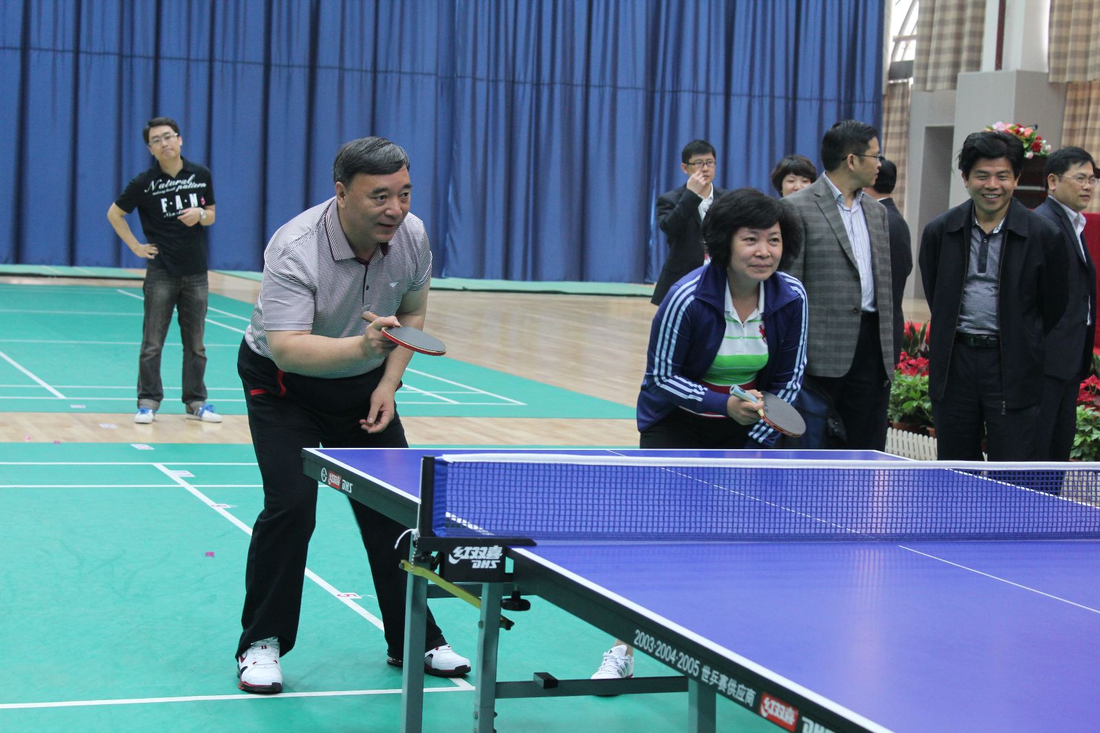 宋志平董事长宣布集团第四届乒乓球比赛开幕,与湘潭市史耀斌市长,姚燕总经理,湘潭市组织部常务副部长徐亚健女士走下主席台 青青草影视免费观看,挥动球拍,为本届比赛开球,并进行了表演赛。