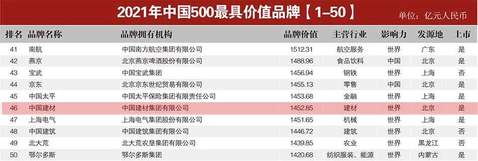 由世界品牌实验室(World Brand Lab)主办的“亚洲品牌大会”于9月23日在上海召开。会上发布了2021年《亚洲品牌500强》《中国500最具价值品牌》排行榜。这是世界品牌实验室第十六次对亚洲品牌的影响力进行的测评, 共有19个国家和地区的500个品牌入选。中国建材集团自“两材重组”以来连续第5年入选榜单,今年以1452 青青草影视,85亿元的品牌价值位列中国500最具价值品牌46位,稳居建材行业第一名。。
