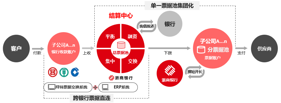 选用银行的单一票据池产品,在总部设一个“总池子”,子公司设立N个“分池”,采用收支两条线票据管理模式,各子公司收到承兑汇票后自动签收,并自动归集到总部结算中心,通过总部结算中心的纽带和上收下拨功能,将集团N个子公司“分池子”连起来,形成一个新型的集团化票据池 青青草影视在线,实现了集团内票据的跨区域管控,打通了集团内部票据的共享通道,解决了公司票据资产的流动性与效益性问题。