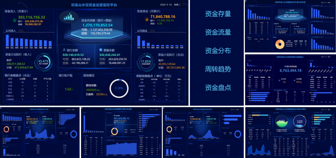 引入大数据风控理念,集成整合ERP、CBS跨银行现金管理系统、祁连山新型集团化票据池等系统数据,建立资金动态展示预警平台,实现了对现金及票据的全级次、全覆盖的可视、可查、可控。