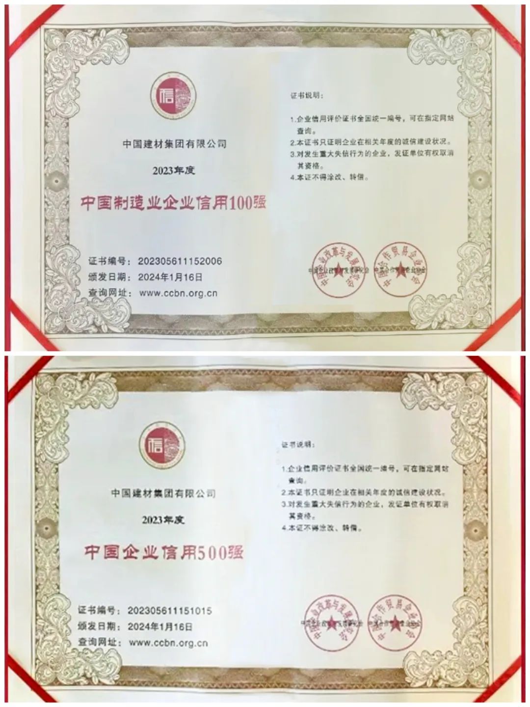 1月21日,由中国企业改革与发展研究会,中国合作贸易企业协会主办的“2024中国企业信用发展论坛暨第十五届诚信公益盛典”在京举行,中国建材集团分别获评“2023中国企业信用500强”“2023中国制造业企业信用100强”第十五位和第六位,这也是集团自2017年以来 青青草影视,连续7年入围该榜单,所属中国巨石,中材科技,北新建材,中材国际入选“2023中国上市公司信用500强”, 中材国际同时荣获“五星级诚信企业”称号并作经验交流。