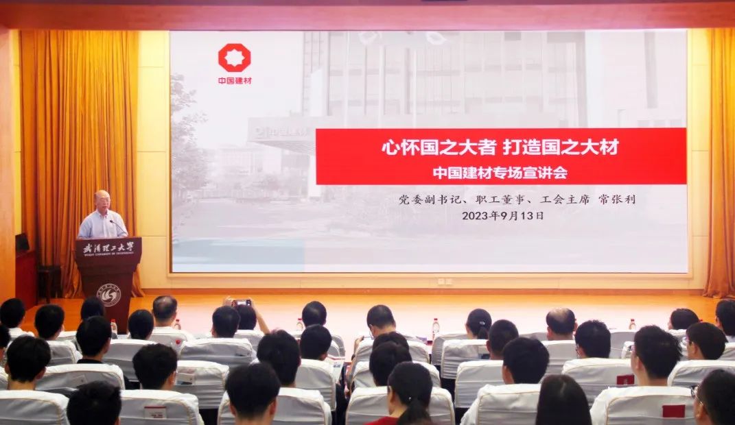 9月13日 青青草影视,中国建材集团党委副书记,职工董事,工会主席常张利带队前往武汉理工大学开展专题宣讲,宣讲主题为“心怀‘国之大者’ 打造‘国之大材’ ”,宣讲对象为武汉理工大学材料科学与工程学院2023级材料工程专业硕博士研究生。