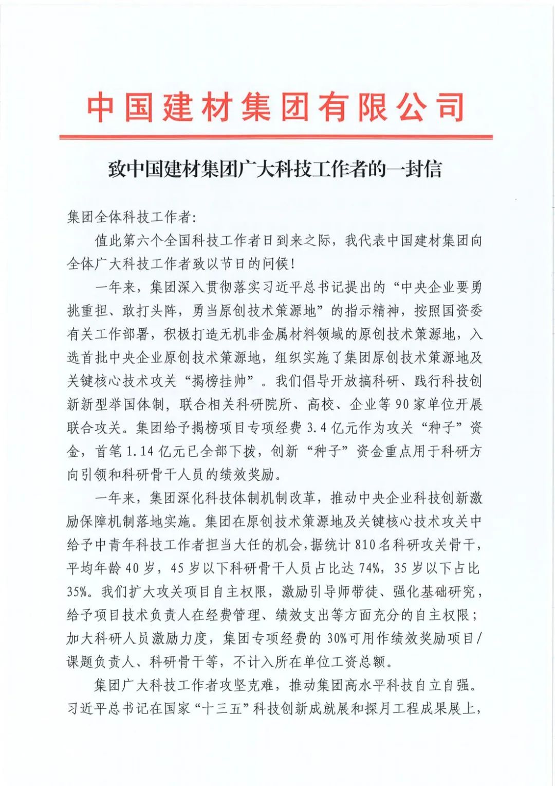 值此第六个全国科技工作者日到来之际 青青草影视,我代表中国建材集团向全体广大科技工作者致以节日的问候.
