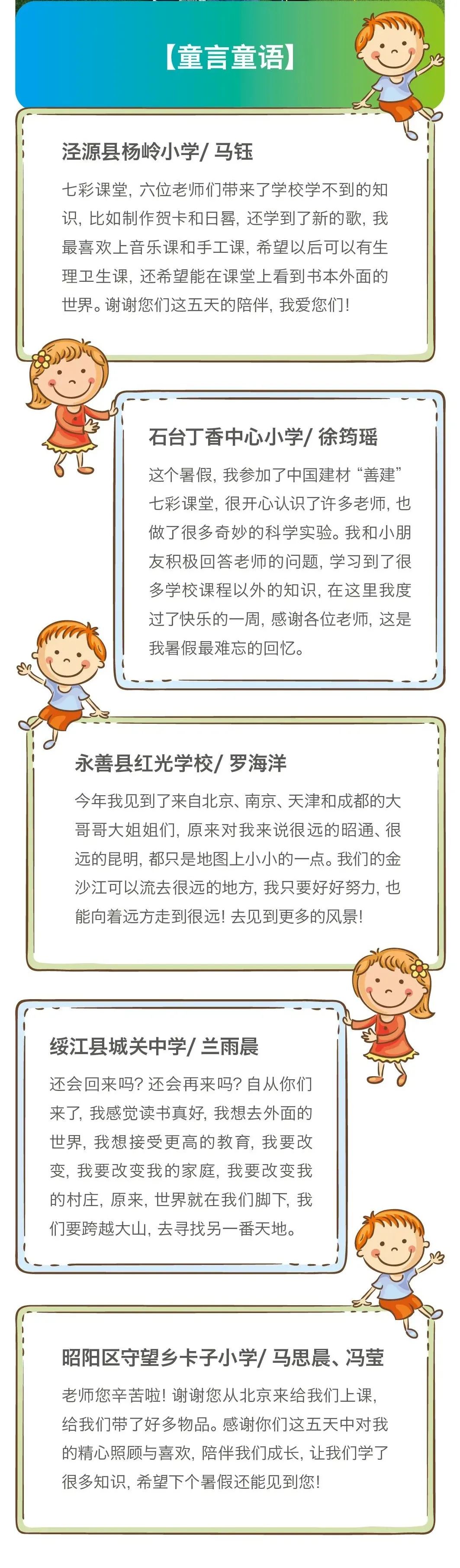 此次“善建”七彩课堂在5个定点帮扶区县设置了15个教学点,覆盖740余名学生,课程设置自然科学,文艺体育,人文历史等内容,还有体现建材特色的各种企业课,革命传统教育要从娃娃抓起的党史教育课,既增长知识,拓展思维,又磨炼意志,强健体魄 青青草影视高清,五天七彩课堂,精彩纷呈,有趣有料,为孩子撑起一片健康成长的天空,将新时代的强音传递到孩子的心坎上,将强国的志向植根在孩子的心田里。