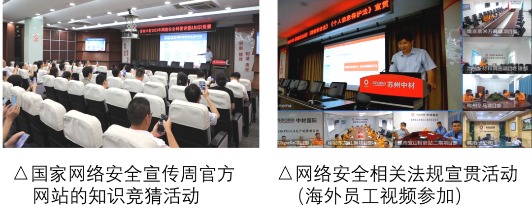 苏州中材建设开展了国家网络安全宣传周官方网站的知识竞猜活动,并组织公司全员(海外员工视频参加)开展了网络安全相关法规宣贯活动。