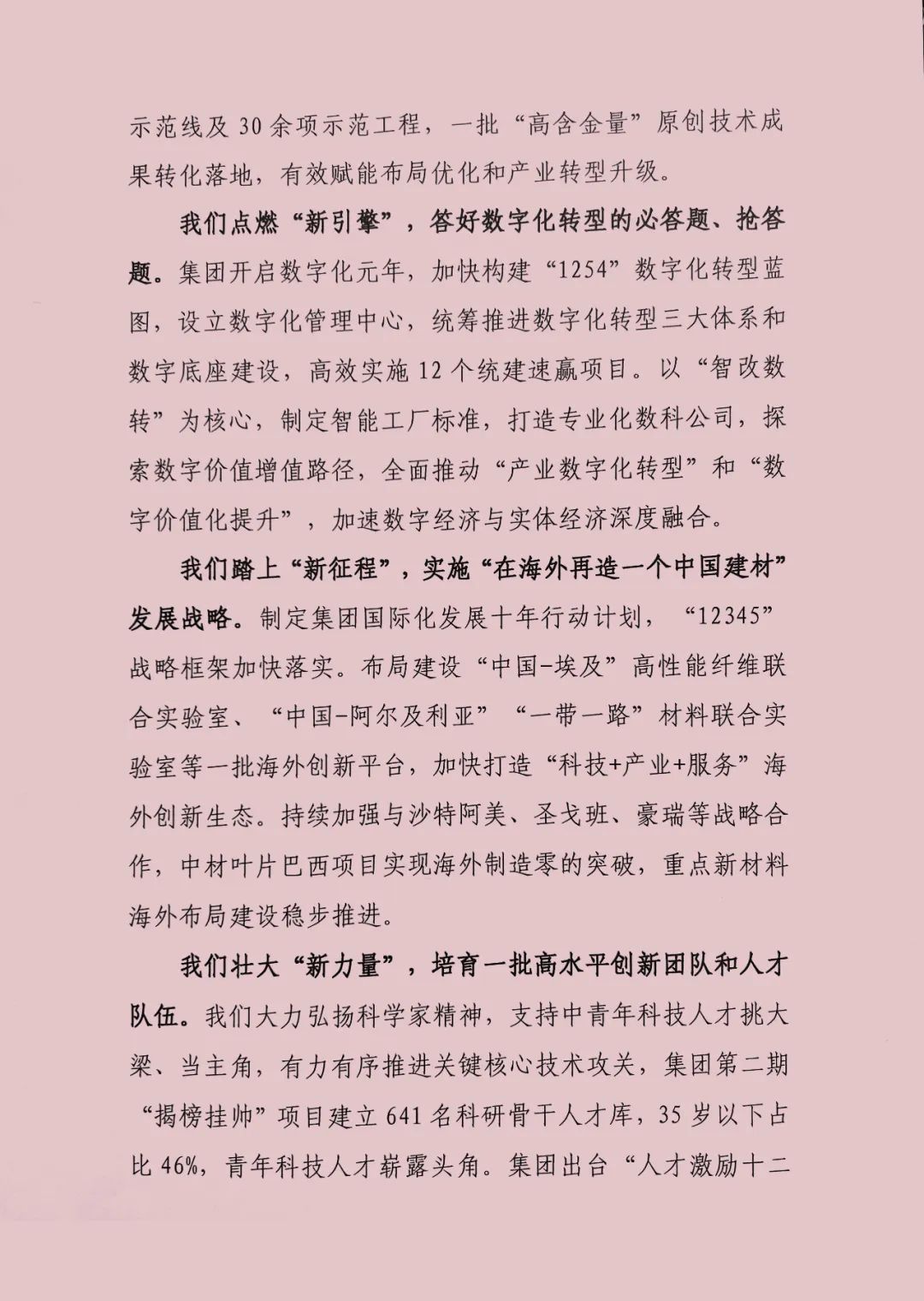 我们踏上“新征程”,实施“在海外再造一个中国建材”发展战略,制定集团国际化发展十年行动计划,“12345”战略框架加快落实,布局建设“中国-埃及”高性能纤维联合实验室,“中国-阿尔及利亚”“一带一路”材料联合实验室等一批海外创新平台 青青草视频,加快打造“科技+产业+服务”海外创新生态,持续加强与沙特阿美,圣戈班,豪瑞等战略合作,中材叶片巴西项目实现海外制造零的突破,重点新材料海外布局建设稳步推进。