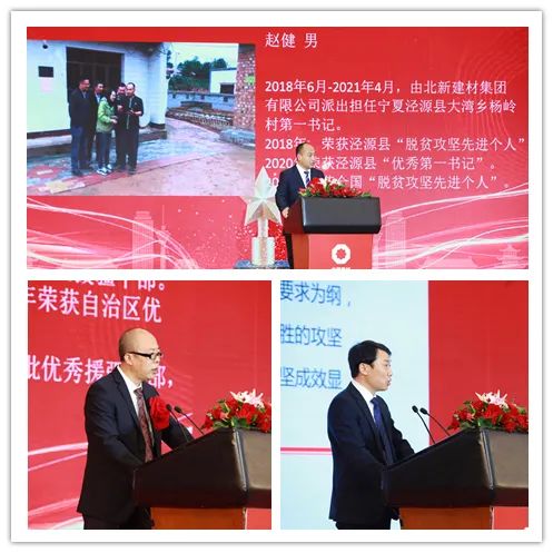 宁夏泾源县大湾乡杨岭村第一书记赵健、第九批中央企业援疆干部白国峰、扶贫工作先进单位代表高鹏涛分别代表受表彰的扶贫干部、援疆援藏干部、扶贫工作先进单位发言。大会还呈现了由凯盛科技员工准备的诗朗诵节目《为了大地春常在》,五县区干部群众访谈节目,中国联合水泥员工准备的七彩课堂节目《愿化星光·点亮梦想》,集团领导、与会嘉宾共同演唱的《歌唱祖国》,为大会营造了浓厚氛围,让大家深受感染、倍受感动。