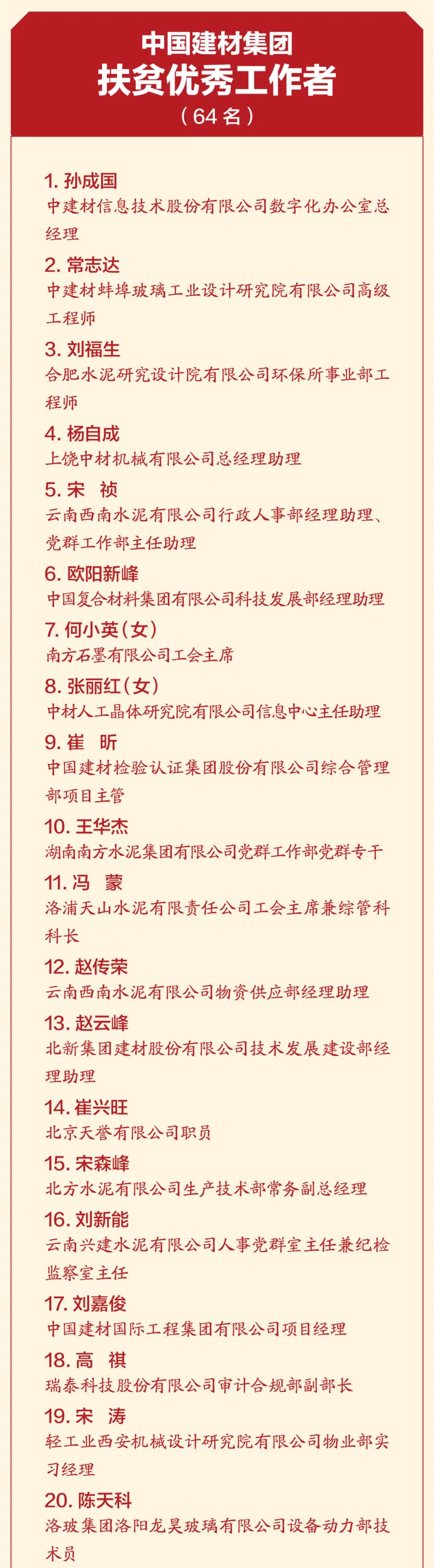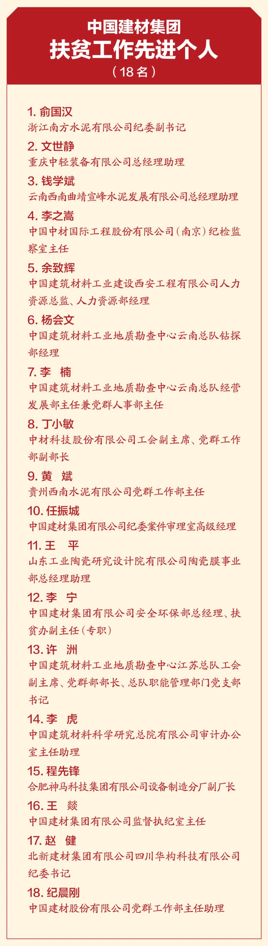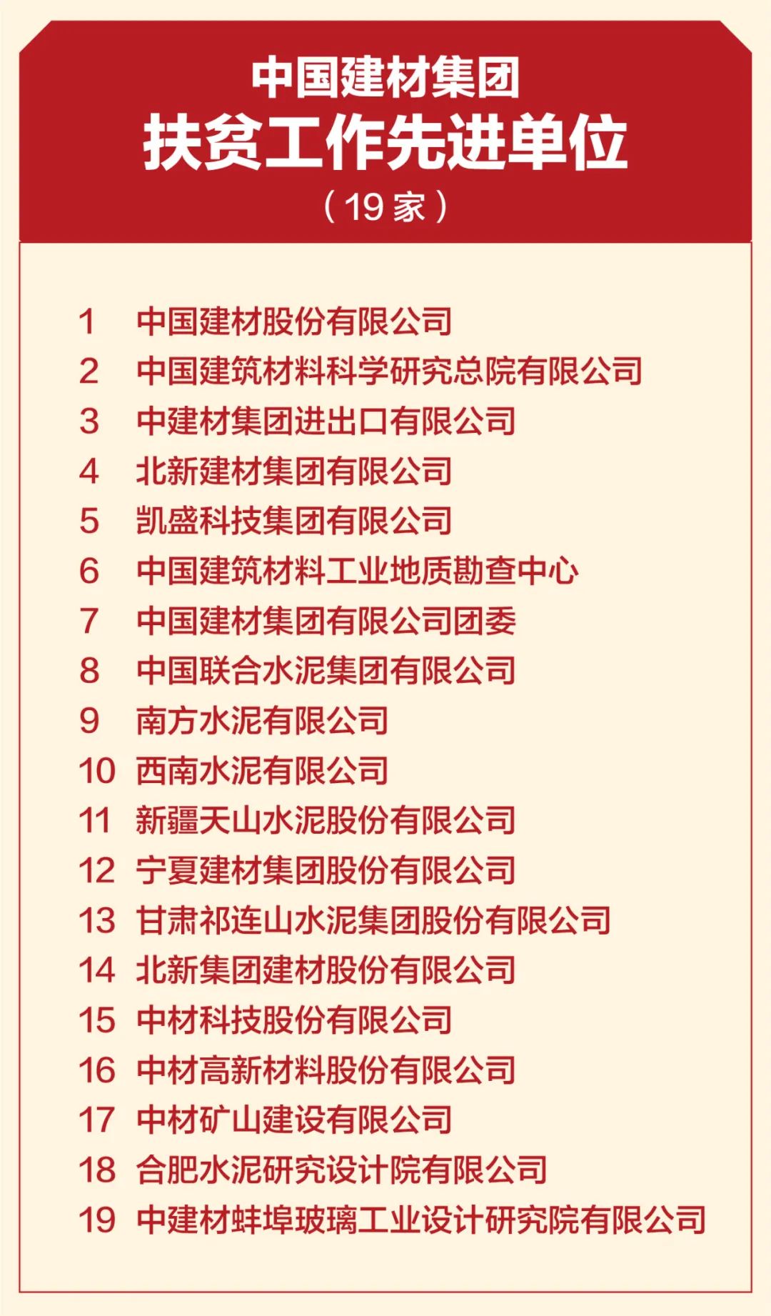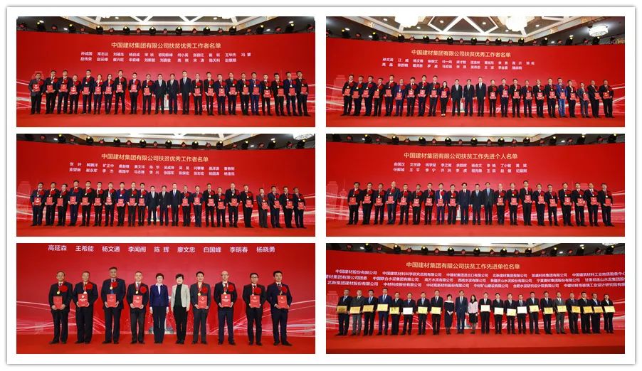 曹江林宣读表彰决定,党的十八大以来,集团积极响应习近平总书记号召,认真贯彻落实党中央,国务院和上级有关单位关于脱贫攻坚决策部署,集全集团之力 青青草视频,尽锐出战,合力攻坚,2020年我国脱贫攻坚战取得了全面胜利,区域性整体贫困得到解决,完成了消除绝对贫困的艰巨任务,集团定点帮扶的五个县区已脱贫出列,援疆援藏工作也取得了阶段性成果,为表彰在脱贫攻坚及援疆援藏工作中涌现出的先进个人和先进集体,充分展现脱贫攻坚成效成果,经集团党委研究决定:授予中国建材股份有限公司等19家成员企业“扶贫工作先进单位”称号,授予俞国汉等18名同志“扶贫工作先进个人”称号,授予高延森等9名同志“援疆援藏工作先进个人”称号,授予孙成国等64名同志“扶贫优秀工作者”称号。