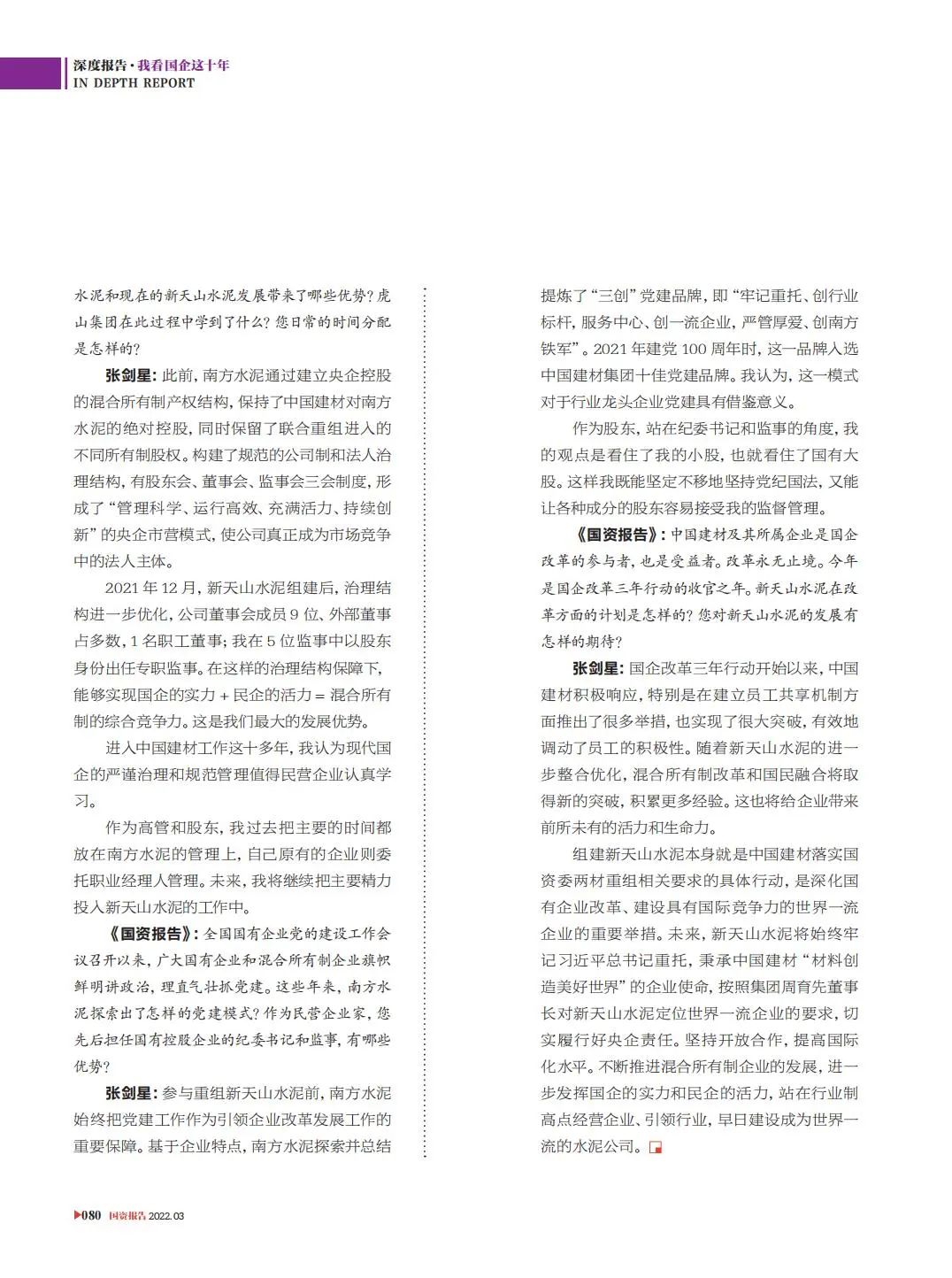 《国资报告》:“国”“民”牵手给过去的南方水泥和现在的新天山水泥发展带来了哪些优势?虎山集团在此过程中学到了什么?您日常的时间分配是怎样的?