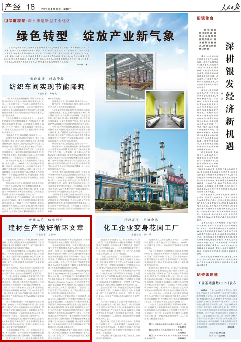 来源:人民日报、北新建材 发布时间:2023-04-134月12日,人民日报刊登文章《绿色转型 绽放产业新气象》,重点报道了北新建材天津工厂坚持绿色制造,通过实现工业固废循环利用,推行“近零排放”污染物治理技术等加快绿色发展实践,小料现将内容分享给大家 青青草影视。