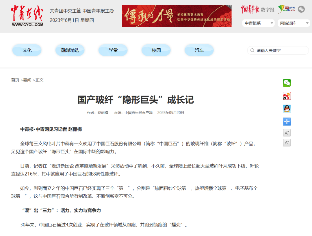 国有资产管理杂志,环球网刊发《“走进新国企·改革赋能新发展”采访活动走进中国巨石》,1999年至2022年,混合所有制改革助力中国巨石经营质量和经营业绩实现跨越式增长,成为了国家混合所有制的典范,迈入新时代,巨石产品研发瞄准市场前沿,不断优化产品结构 青青草影视免费观看,以创新布局高端应用领域,把握科技革命大势,全力赋能智能制造,引领玻纤工业数字化变革,国际拓展,打造高质量发展的海外“增长极”,强化绿色生产过程,完善绿色设计理念,实现可持续发展。