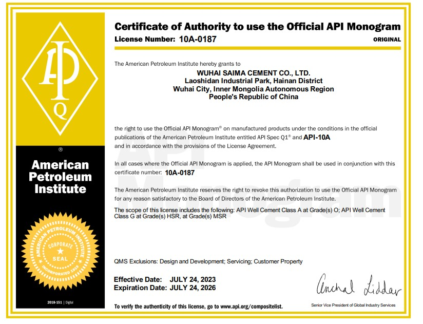 乌海赛马自2018年生产高性能高抗硫固井材料以来,通过对油井水泥原燃材料选用,生产工艺参数制定以及生产过程检验等方面进行精细管控,产品质量指标达到优于国家标准,2022年9月,公司向美国石油协会提交API首次认证申请,经过远程 青青草影视,现场审核,取得了API Spec Q1质量体系认证证书,目前是内蒙古自治区唯一一家油井水泥,固井材料生产企业,同时也是内蒙古自治区水泥行业第一家获得此证书的企业。
